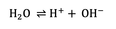 Unlike typical chemical reactions, the arrow points in both directions. This indicates that the reaction proceeds both from left to right and from right to left. In water, water molecules do not always exist solely as H₂O; they continuously dissociate into H⁺ and OH⁻ ions, while these ions recombine to form H₂O again.