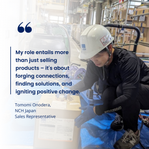 まだ NCH を知らない方々へ…私は未経験でこの仕事を始めました。メンテナンス剤やケミカルなどまったく分からず、工場へも入ったことなどありませんでした。ですが、先輩方のアドバイスや会社のサポートにより、ひとつずつ知識を得て、今こうして毎日充実した日々を送っています。もちろん時に大変だと思う事もありますが、自分の裁量で仕事ができること、多くの人との関りが毎日のやりがいを与えてくれます。これからも仕事とプライベート、共に楽しんでいきたいです。