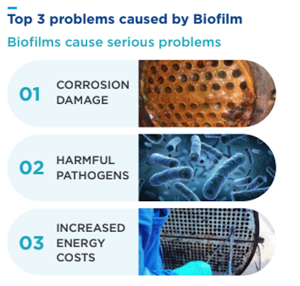 Biofilms are colonies of surface attached microorganisms growing inside a bacterial secretion. Once established, biofilms are very difficult to remove and control.