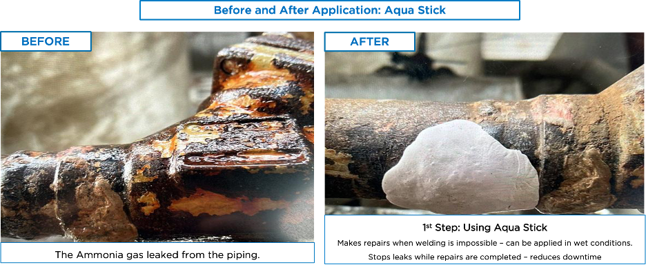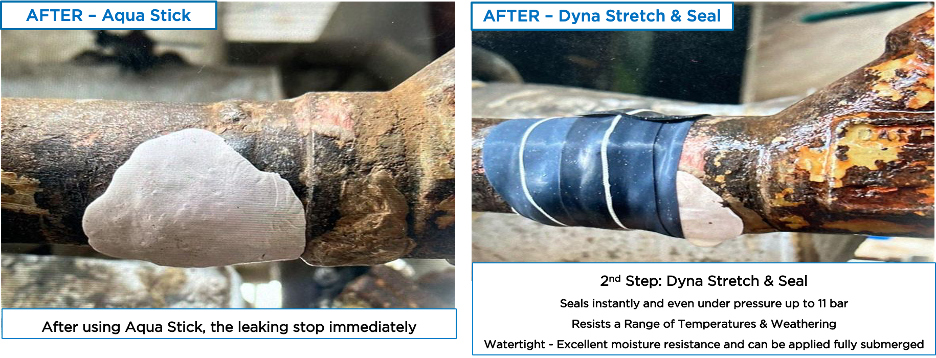 The first step involved using Aqua Stick, a repair solution that works in wet conditions and can stop leaks while repairs are completed, reducing downtime. Aqua Stick was applied to the leaking pipe, and the leakage immediately stopped.