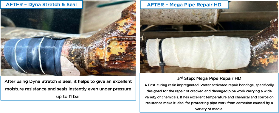 Finally, Mega Pipe Repair HD was used to apply a fast-curing resin impregnated, water-activated repair bandage specifically designed for repairing cracked and damaged pipes carrying a wide variety of chemicals. The excellent temperature, chemical, and corrosion resistance made it ideal for protecting pipe work from corrosion caused by various media.