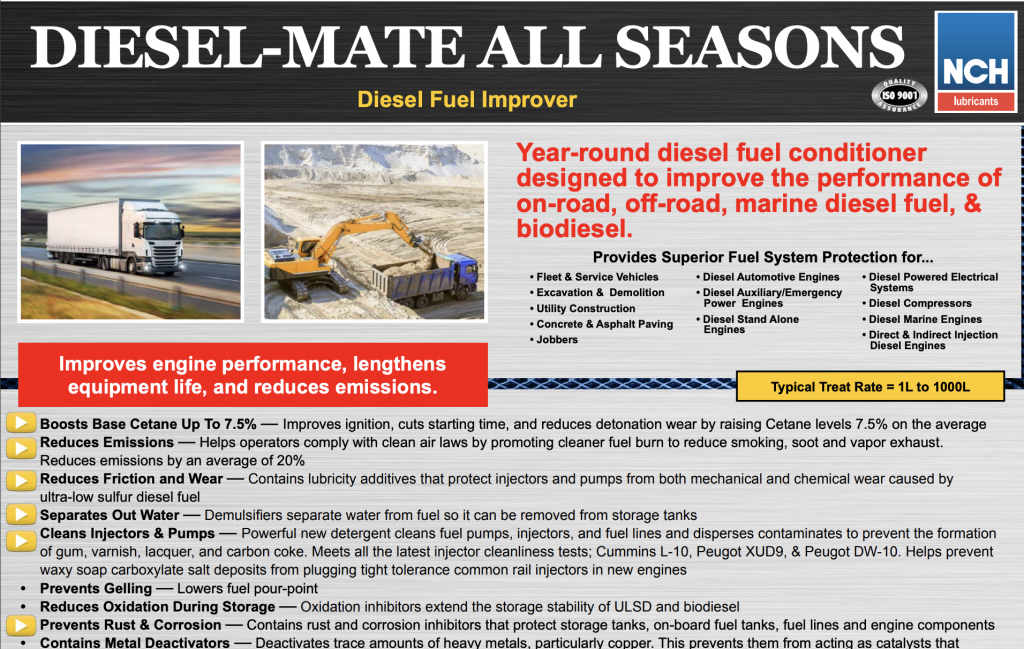Diesel-Mate is a year-round diesel fuel conditioner designed to improve the performance of on-road, off-road, marine diesel fuel, and biodiesel. The fuel quality improver works hard to enhance engine performance, lengthens equipment life, and reduces emissions.