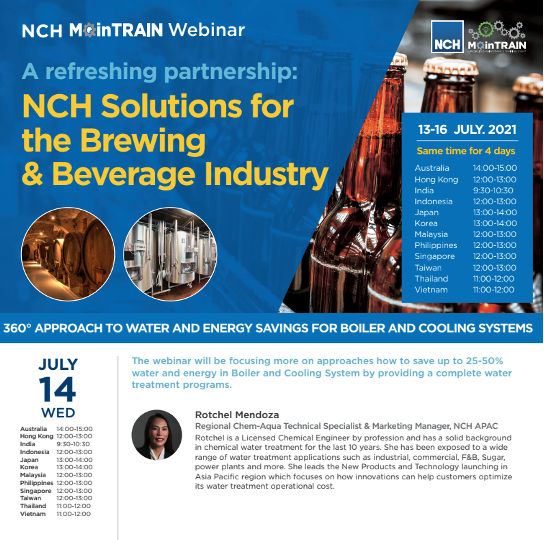 This year we will feature best practices for the brewery, wine, soft drink, juice, food & beverage industry through exclusive seminars led by our Asia-Pacific team leaders as technical speakers. We will showcase the latest solutions in pasteurization, water treatment, lubrication, and biological wastewater treatment. We will provide technical accreditation for attendance, and we look forward to a meaningful exchange of expertise in NCH product and service technologies for the industry.