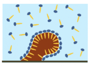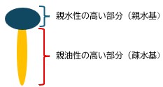 水溶性洗浄剤には通常、界面活性剤と呼ばれる成分が入っています。聞きなじみがない方も多いかもしれませんが、石鹸、ボディーソープ、洗剤などの主成分も界面活性剤です。界面活性剤は、下のように親水性の高い部分と親油性の高い部分が合わさったような構造をしています。