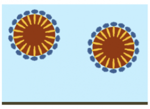 3️⃣油が完全に界面活性剤に取り囲まれて、球体のような状態(ミセル)となって水中に分散します。