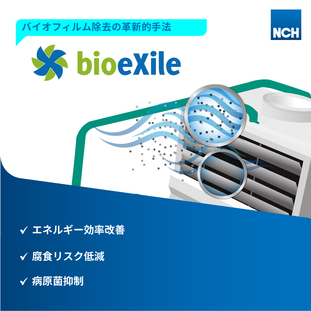 bioeXileはバイオサイドの常時/定期投入では防ぎきれない頑固なバイオフィルムを一掃し、システム全体を清浄に保つための強力な武器です