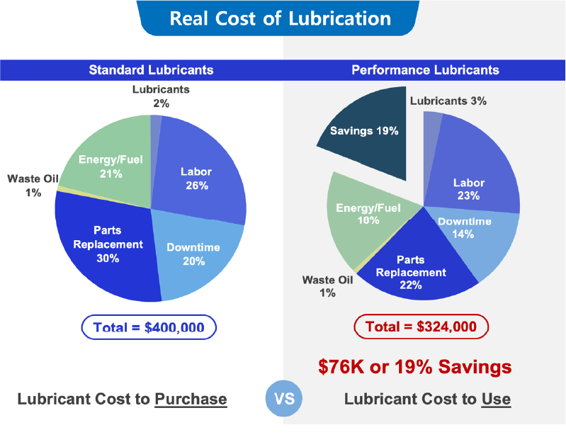 Lubricants alone can be responsible for relevant reductions in the 6 points highlighted above. Lubricants alone can be responsible for relevant reductions in the 6 points highlighted above. In a study conducted in the early 2000’s by NCH Corporation among a sample of 600 customers across the world, we identified that by moving from standard lubrication to premium performance-enhanced lubricants, the savings amounted to an average of 19% of the total maintenance budget.