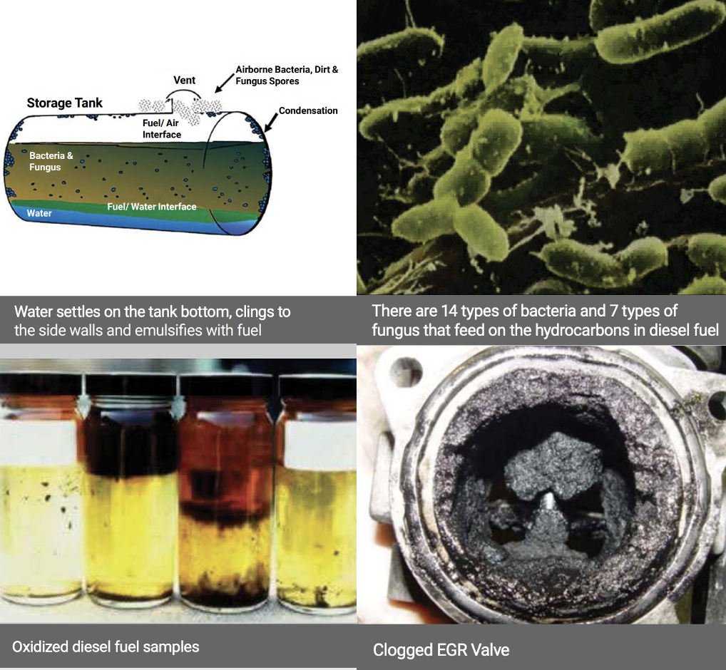 곰팡이와 박테리아는 통풍구나 수질 오염을 통해 연료에 유입되며, 바이오디젤은 특히 생물학적 성장에 취약합니다.