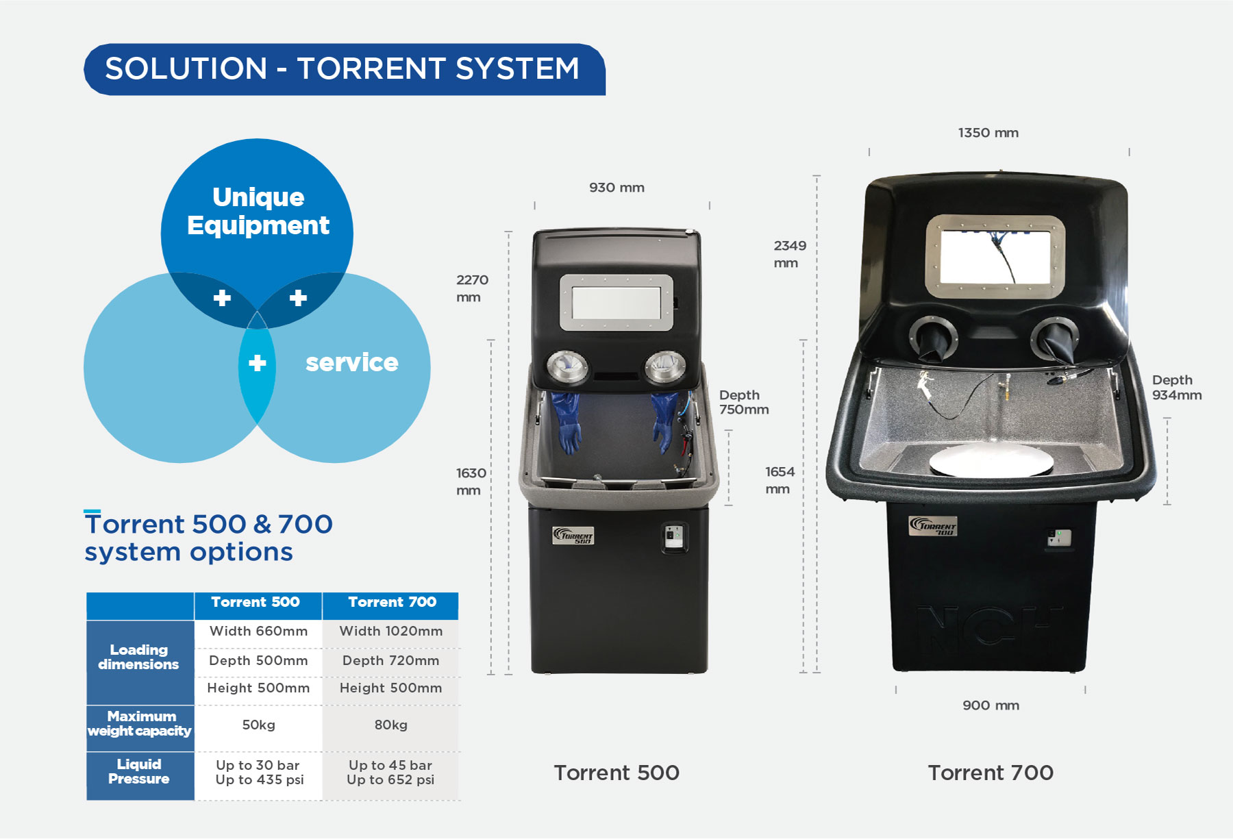 완전 밀폐형 대형 부품 청소기인 Torrent 700으로 단 1분 만에 부품을 청소할 수 있습니다.