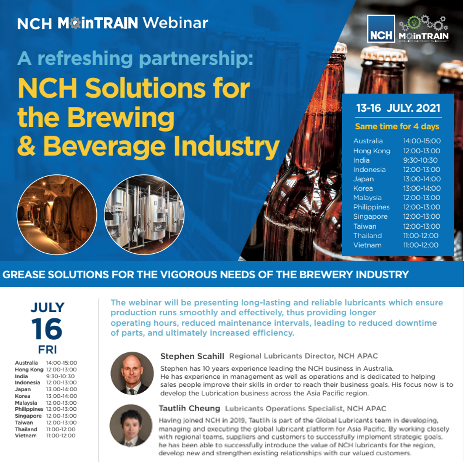 This year we will feature best practices for the brewery, wine, soft drink, juice, food & beverage industry through exclusive seminars led by our Asia-Pacific team leaders as technical speakers. We will showcase the latest solutions in pasteurization, water treatment, lubrication, and biological wastewater treatment. We will provide technical accreditation for attendance, and we look forward to a meaningful exchange of expertise in NCH product and service technologies for the industry.
