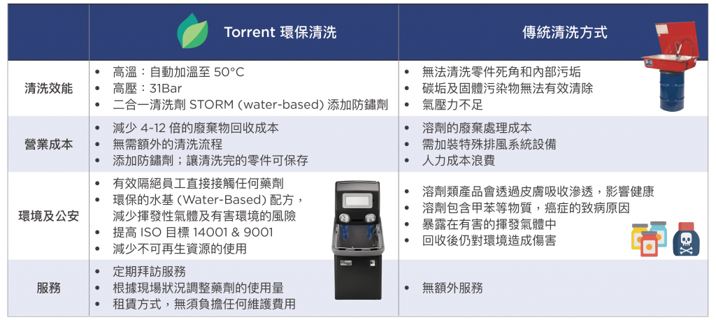 - 避免有毒煙霧及潛在火災–NCH亞太區的Torrent零件清洗機,使用水性溶液降低危險。